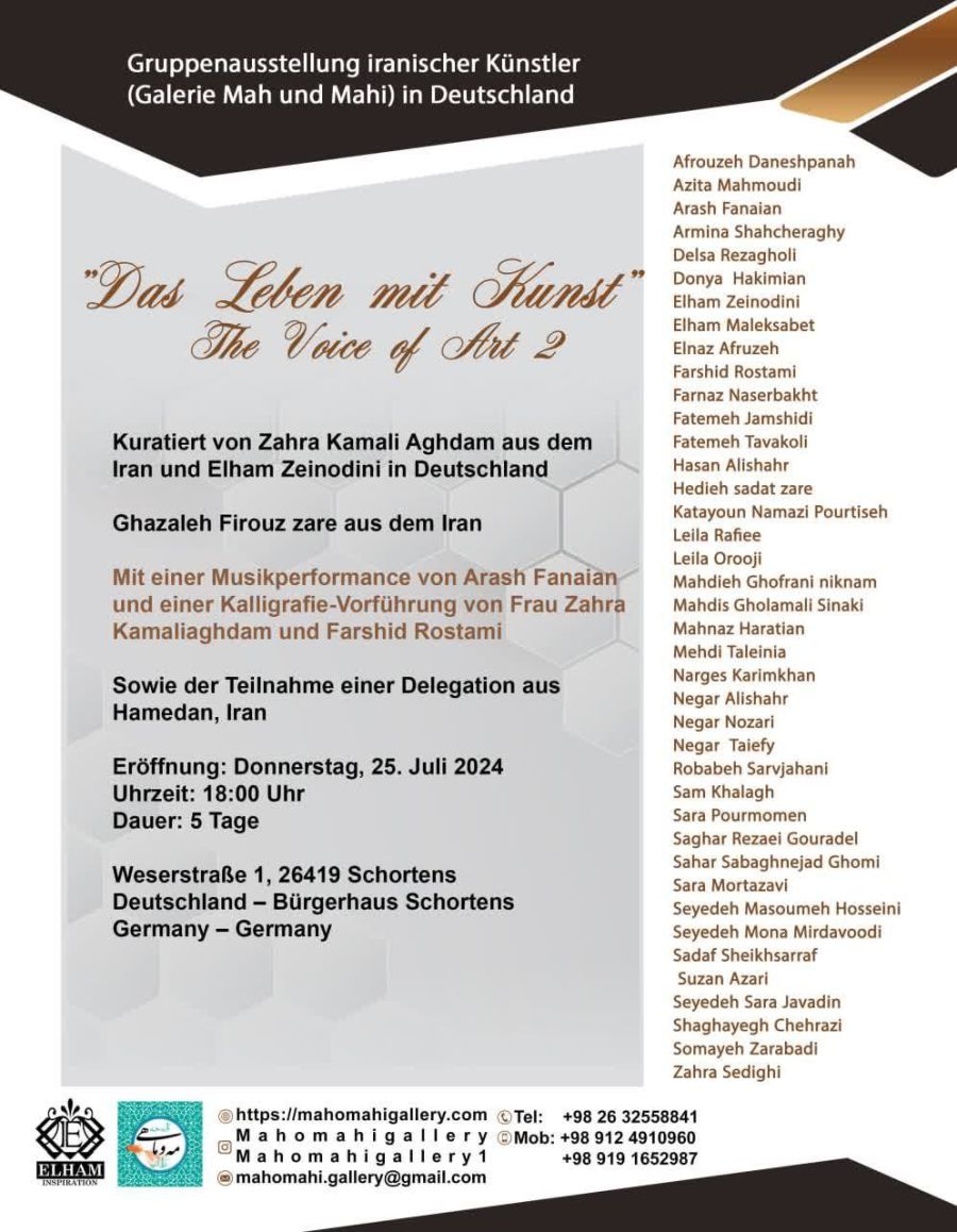 Vom 25.07. bis zum 31.07.2024 findet die neunte Kunstausstellung iranischer KünstlerInnen unter dem Titel “Life with art: The voice of Art 2" im Bürgerhaus statt. Am Eröffnungstag wird es ab 18:00 Uhr eine Kalligrafie-Vorführung der beiden iranischen KünstlerInnen Zahra Kamali und Farshid Rostami sowie eine Live-Musik-Darbietung von Arash Fanaian geben.